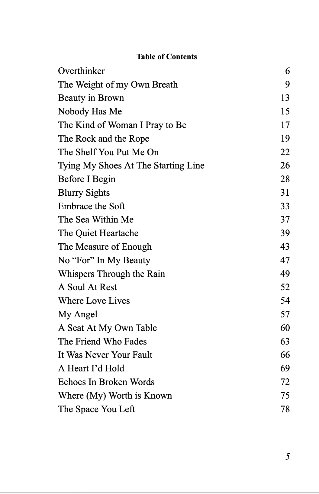 This poetry book is a love letter to the soul. Whispers Between the Pages is a collection of poems rooted in faith, healing, identity, love, and becoming. These pages hold soft truths and sacred questions—written for the quiet-hearted, the deeply feeling, the ones learning to speak up again.